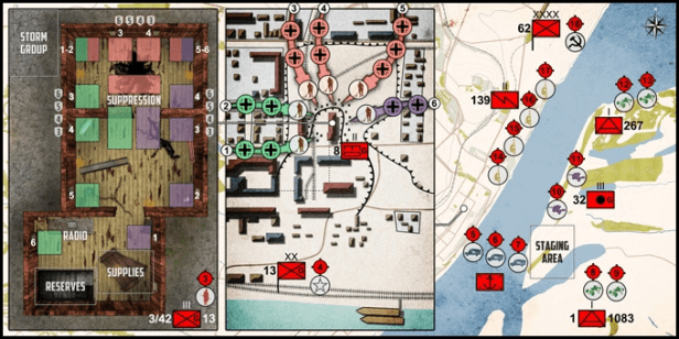 The game board depicts three different views of the Stalingrad battlefield that all play a key role in the success or failure of the defenders in Pavlov’s House.