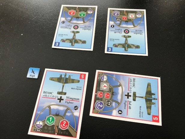 There is no board with Wild Blue Yonder, as cards are simply laid out on the table facing each other and two mechanisms are used to represent the spatial relationship between aircraft. First is Altitude. At the beginning of the game, each player will take an Altitude counter of their choosing to reveal simultaneously to identify their starting altitude. If aircraft are at differing Altitudes, an Attack card cannot be played until they are at the same level. This can be accomplished by the active player simply adjusting their Altitude at the start of their turn. This will however have a cost, or even a possible benefit. In order to adjust your Altitude up one level, you must discard a card. If you are adjusting down, you will pick up an extra card. Once the opposing aircraft are at the same level, then an Attack card can be played.