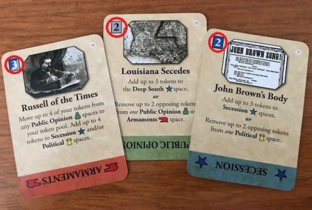 The central concept of the game is that of manipulating the various spaces on the map by playing Strategy cards, either for their event or for the number of Political Capital Tokens that can be placed. The number in the upper left hand corner of each card is what is referenced when playing a card for the Political Capital Tokens. The picture below shows three cards, two of which offer 2 Political Capital Tokens that can be placed in any space and one that offers 3. You will also notice that behind the numbers are colored boxes which are important in relation to the printed events on the cards. If the square matches your role, either that of the Unionist (blue) or the Secessionist (gray), rather than simply using the card for the points, you then are granted access to the printed event, which typically is more powerful than the numbers.