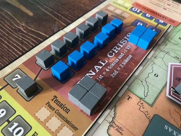 Along the left side of the game board lies the Crisis Track, which consists of two separate tracks that represent the Unionist and the Secessionist player’s handling of the Secession Crisis. From this track, players will gain Political Capital Tokens that can be used through card play to be placed on the board in various map spaces to attempt to control individual spaces or even an entire Crisis Dimension. This Crisis Track is made up of four different zones including Starting, Escalation, Tension and Final Crisis. These are marked clearly with different colors to aid players in knowing when they are about to enter into them. These zones are where all Political Capital Tokens start and once retrieved from the track and placed in zones, are never returned. When card play requires the player to take the first Political Capital Token from one of the Crisis Track Zones, this is referred to as a breach. Don’t worry though, the first breach of the first zone is “free” and there is no inherent penalty with entering Escalation. This just means that the game is progressing and players are getting into the political debates over the various issues.