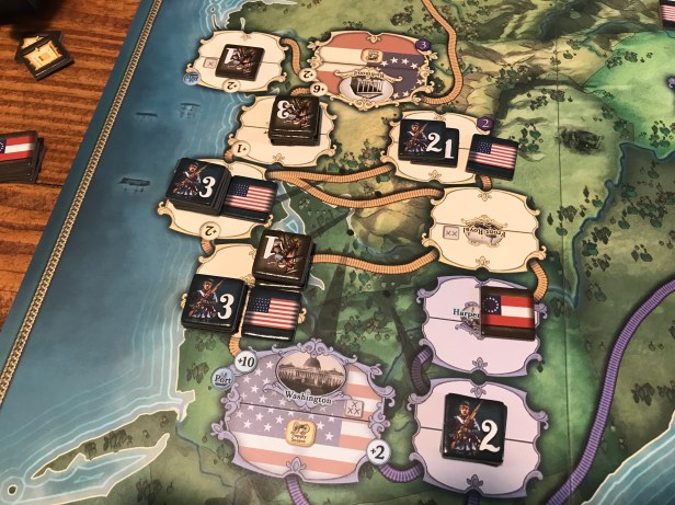 We found that this game has a lot of strategic choices for both sides. As the Confederates you simply have to slow down the Union player from getting the appropriate number of VPs so sometimes you just want to attack lightly in key areas and draw his attention while playing your cards very carefully. The Union player has got to be aggressive and use their power to win the day but there also are many strategic choices such as how much they try to blockade the CSA which will limit their hand size and give them less choices. This is one of Martin Wallace’s finest games and we absolutely loved our few plays.