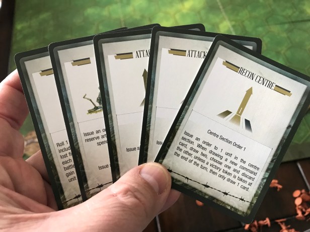 In the box you’ll find a bunch of black, red and green dice with a varied number of hits and armour symbols on them. You roll the dice to see how effective your fire attack is. You only roll some of the dice however. You start with a pool of the black dice. There’s a series of combat modifiers from range, terrain, unit status, special abilities and many more. These modifiers are totaled and the net modifer adjusts the dice being rolled. A positive net modifier will upgrade that many black dice to the more potent red dice. A negative net modifier will downgrade that many black dice to the very weak green dice. That’s it. Pretty cool system that was a bit difficult to keep straight at first but which became easier as we played and really made you think about how you were going to attack.