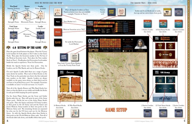 Once We Moved Like the Wind, The Apache Wars, 1861-1886 covers these central conflicts of the American South West. The game is played as a series of turns, each of which follows a sequence of play that begins with determining how bad a provocation results in conflict for the turn. The provocation level determines the forces each player will have for the turn and their general placement on the map. Next the Apache player moves the Apache forces and then the Army Player moves the US and Mexican forces. Combat may then occur between opposing player forces that share a location. After any combat is resolved, victory points are counted up and the player with the most for the turn earns one increase in victory level on the Victory Track. Play then repeats for the next turn to the end of the game when the player with the higher level on the Victory track is the winner.