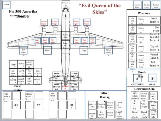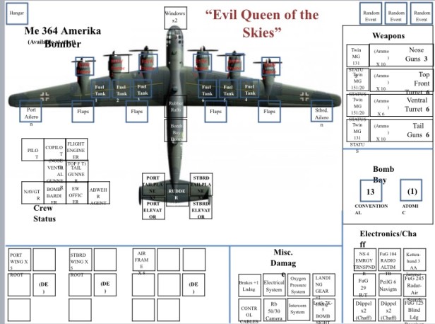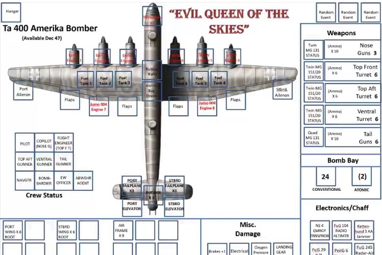 Greg: There are a multitude of systems on the aircraft that can be damaged (to include crew injuries) and they all have different effects on your ability to get home. Some are reasonably minor (flap and elevator hits, and airframe and wing root hits) while some can be catastrophic (fuel tank hits, engine hits.) Pretty much everything on the plane can receive some kind of damage. US fighters inflict random damage, and this is rolled up on the damage charts.