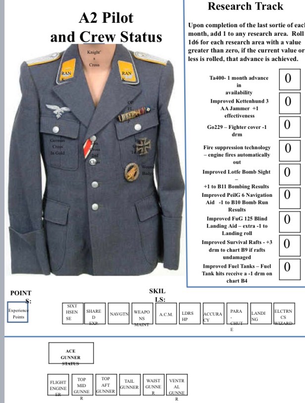 For example, “Parachute” skill gives the benefit to the entire crew and “Weapons Maintenance” which allow you to ignore the first knocked out gun result are similar to NF Ace, but there are several completely new skills: “Electronics Wizard” (your EW officer can repair one inop or damaged system per sortie), “Sixth Sense” (the pilot converts any “6” damage roll into a “3”) and “Leadership” (the Pilot gets -2 to each promotion roll.) Spend those points wisely – they are precious. You really need to decide to go after the offensive skills, the defensive skills, or a mix.
