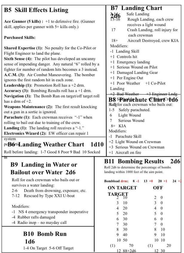 Greg: Well, one thing I disliked about B-17 was that the combat was a bit dice heavy and tedious (and coming from me, Mr. “I Love to Roll Dice” Smith that’s saying a lot.) So I streamlined the procedures a bit. There’s less aircraft hitting you, usually, than in B-17, but they can be nasty. They also can approach you from one of 26 possible orientations (they approach from directions 1-8 at high, level, or low [first 24] and then also possibly a vertical dive attack or a vertical climb.) I achieved this by rolling a 1d10 combined with a 1d6 for altitude. Works like a charm 🙂 Combat is very simple – you hit or you don’t, they hit or they don’t, if you miss them they come in closer.