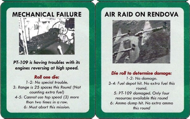 Rod: The reason for including an “event” phase, was that I wanted to allow for various events to occur on a random chance. For the most part these events are included in the game to allow for things that actually happened to Kennedy and his crew, but were not part of any specific intention on their part. For example, the engine breaking down, or a Japanese Air Raid on Rendova which interrupts PT-109 before it gets started in preparing for its assigned mission for that night. Other events might either help or hinder the PT boat by increasing, or decreasing its combat factor, speed, fuel capacity, and resources. Depending on the mission to be carried out, some or all of these factors, generated by the event deck, might have major consequences in the ability for the PT boat to complete a successful mission.