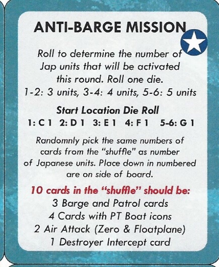 Rod: The Mission Card states what mission is to be carried out and what possible Japanese units the PT boat might encounter. It also states the number of possible Japanese units as well as their starting locations. In order to best explain, it might be helpful to view one of the Mission Cards.