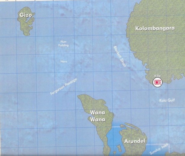 Rod: The map covers the area of the Solomon Islands from Rendova at the bottom of the map, to Gizo and Kolombangara at the top. For game purposes the top of the map is considered “North” and the bottom “South.” This somewhat of a distortion in order to facilitate game play. When the AI moves units “South” “East” or “West” it simply means that they move “down”, “right”, or “left” respectively. Below is a portion of the map. The artist is Bruce Yearian. Bruce did a wonderful job on the cards, map, and game pieces. I am very pleased with his work.
