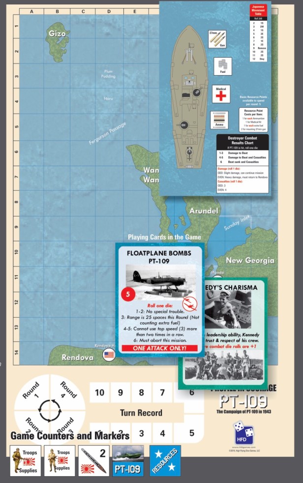 Rod: The Boat has an intrinsic strength of one Ammo factor, a load of torpedoes enough to conduct two attacks, and fuel enough for a range of 30 spaces on the map. At the Rendova base, the player has an additional 5 Resource points available. These include extra fuel, extra ammunition, medical supplies in case the crew suffers casualties, and a 37mm anti-tank gun (if the right event card is drawn) that can be mounted to the bow section of the boat to provide extra punch in combat versus barges.