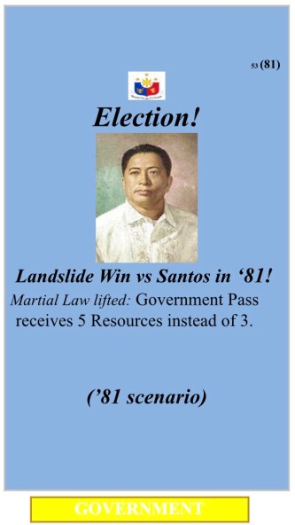 In the context of the scenario and the game, the landslide victory marks the beginning as the Election! Card “Landslide Win vs. Santos in ’81!” starts located on the Aquino Fate Holding Box on the map board. This gives the Government player a Government Momentum card to start. That allows a Government Pass option 5 Resources instead of the usual 3, an additional 2 Resources as an extra incentive for the Government to use. Besides the Election! Card, the scenario adds 6 more Event Cards (Sparrow Units, Pata Island, Public Speeches, UNIDO Boycott, Pope John Paul II Visit and VP Bush Toast) and 3 more Personality Cards (Santos, Jovito Salonga and Rodolfo Salas – 1 Government, Reformers and Insurgent each) to add to the game.