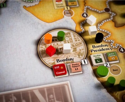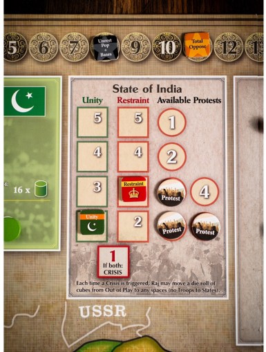 Jason came up with the brilliant idea of Muslim States for the Muslim League. In the early campaigns, Congress saw the Muslim League as an ally, with aligned interests. In the game, whenever the Muslim League builds Opposition, Congress also gains victory points. This will be increasingly frustrating for the Muslim League player until they have built up their position to the point where they can shift their alliance to the Raj and exchange Opposition for Muslim States.