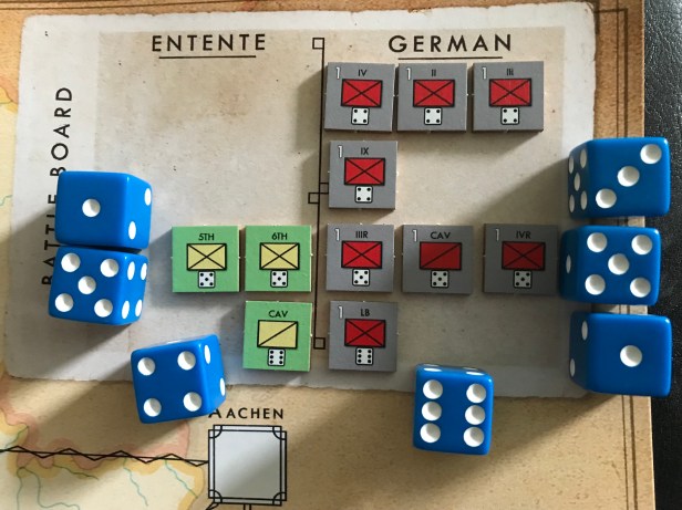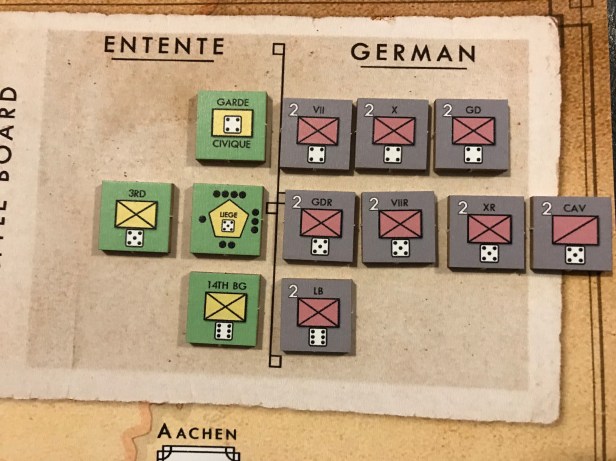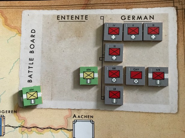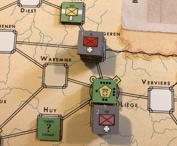 If during an Army’s Activation any Boxes contain Units belonging to both sides, Combat occurs. Pretty simple and straightforward definition that harkens to the game’s focus as an introductory wargame. The first key to Combat though is understanding your forces and their capabilities. If you look in the picture below at the Belgian stack that is located in Tongeren with the German 1st Army, you will immediately notice the difference in the number of (Belgians only have 3 units as compared to 8 units for the Germans) units and their quality. The 6th Belgian Army will only hit on a roll of a 5+ on a 6 side die or 33% while the IV Corps of the German 1st Army is better as it will hit on a roll of 4+ on a 6 sided die or 50%. The game is called Brave Little Belgium after all and not necessarily Strong Dominant Belgium. Belgium and the Entente will not necessarily win the game through military dominance but through deft strategic movement and simply slowing the German advance.