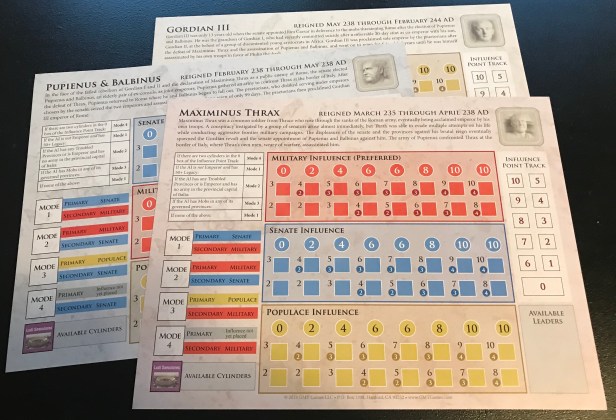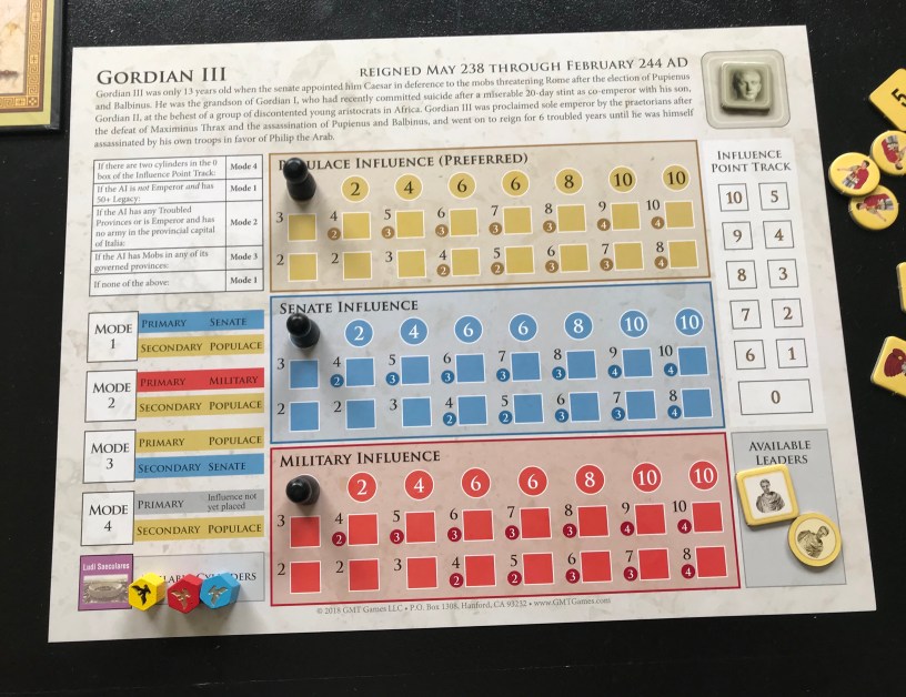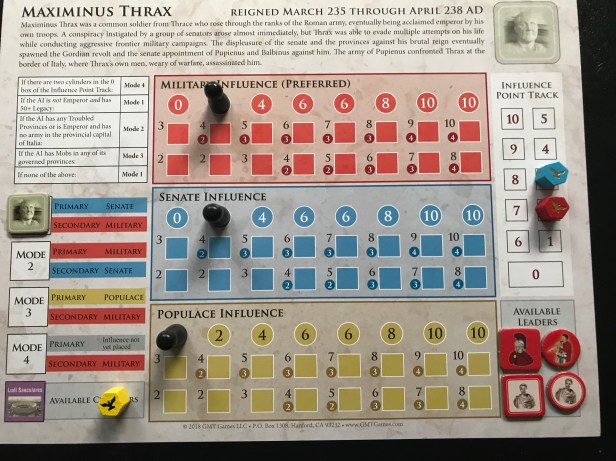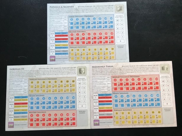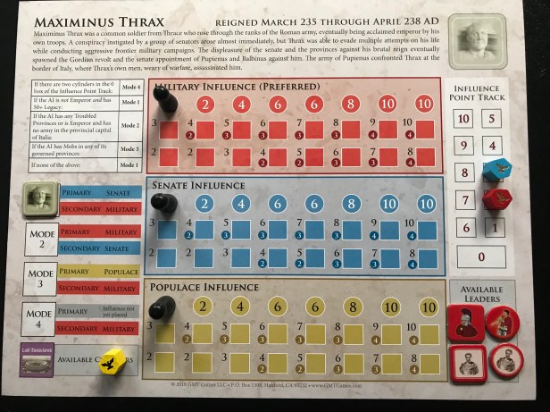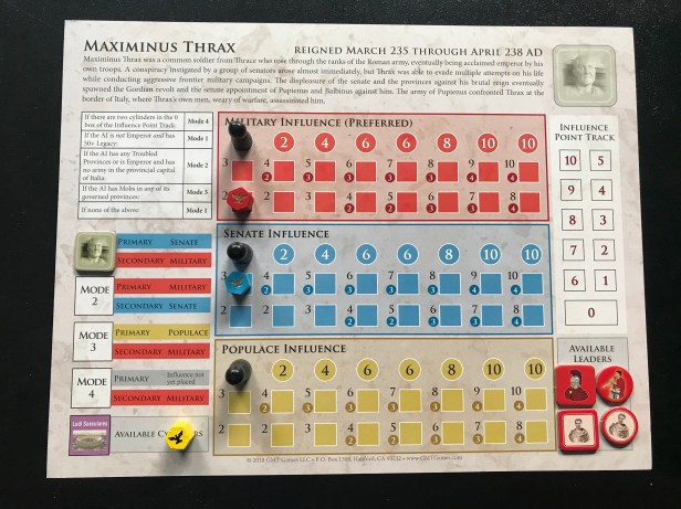 The designers took great care to develop this system so that each of the three Bots provided will have a very different focus for their desired area of influence. This focus can readily be figured out by looking at the top influence area on the mat. The three AI Bots are characterized as Emperors from the Year of Six Emperors (238 AD) – Pupienus & Balbinus prefer Senate Influence, Gordian III prefers Populace Influence while Maximinus Thrax prefers Military Influence (with a name like that were you expecting anything else?). The Bots will generally increase their available power in their preferred area the fastest and will therefore have more to spend on actions of that type and will use a focused strategy.