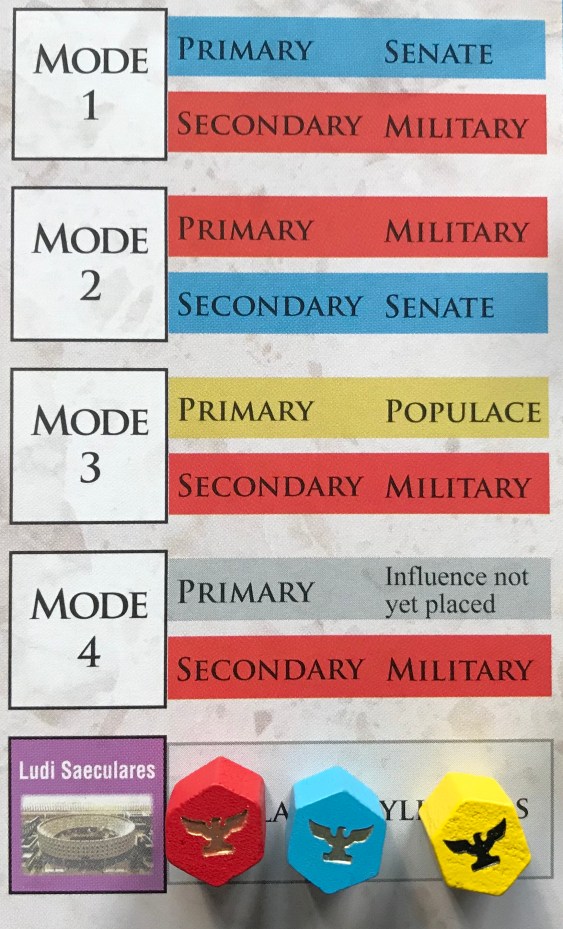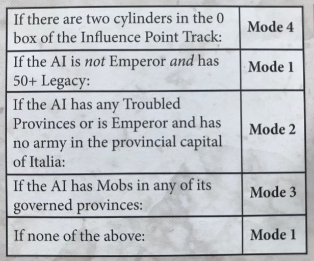 On the first turn, we follow the table down until we see that the Bot matches none of the stated situations and then places its marker in Mode 1. Why is it doing this? Well it is typically only the case at the start of the game as there typically is nothing vexing them right away and being in Mode 1 will cause them to begin building their preferred influence. Senate will be his Primary influence and Military will be his Secondary influence. In the case of Maximinus Thrax, a cylinder is placed in the top box below its Senate pawn, showing that it will have 3 Senate influence to spend this turn. A second cylinder is placed in the bottom box below its Military pawn, showing that it will also have 2 Military influence to spend this turn. If the boxes chosen included the small circles with numbers you would also play an event. The events are listed on the AI player aid.