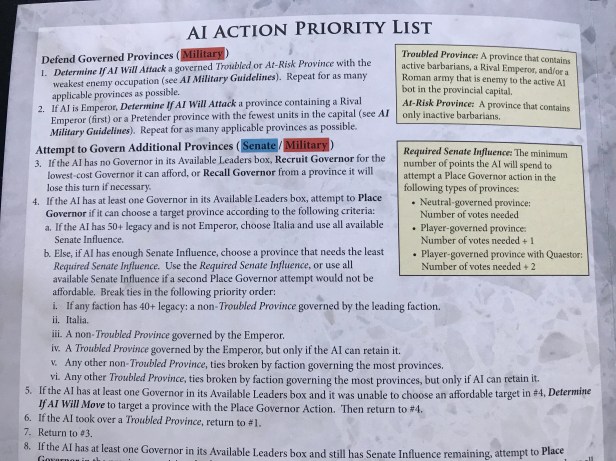 Overall, this explanation of the Non-Player AI Bots in the game was woefully inadequate but does at least expose you to how it works, or should in theory. We found the Bots to be fun and a bit unpredictable at times which actually added to the theme of the game and its chaos as the Roman Empire was collapsing in on itself as everyone wanted to be in control. Whilst the methodology of the bots might sometimes seem suspect the outcomes of the AI are fairly reasonable. So just play their turn through before saying “why did they do that?!”