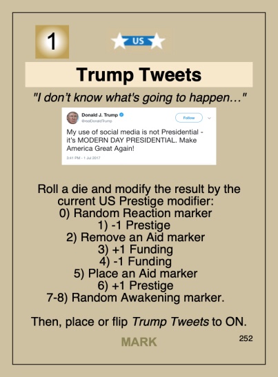Trevor: Three cards come to mind as both pivotal and unique to this design: Trump Tweets – There are three copies of this card in the deck, each with a different tweet but the same event effect, which is a random element that may benefit the US or the Jihadist player. The design intent is obvious as is the commentary on Trumps chaotic leadership style! BUT, the play of this card is necessary to allow the play of about 10 other events in the deck, so it will see a lot if use.