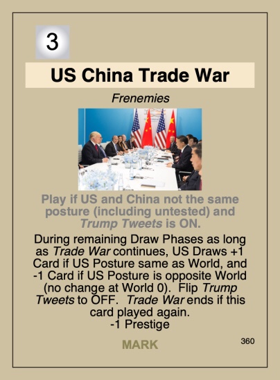 US China Trade War – This non-Middle East card has potential long-term consequences in the number of cards the US player draws in future turns, depending on how the trade talks go as represented abstractly through US and China posture.