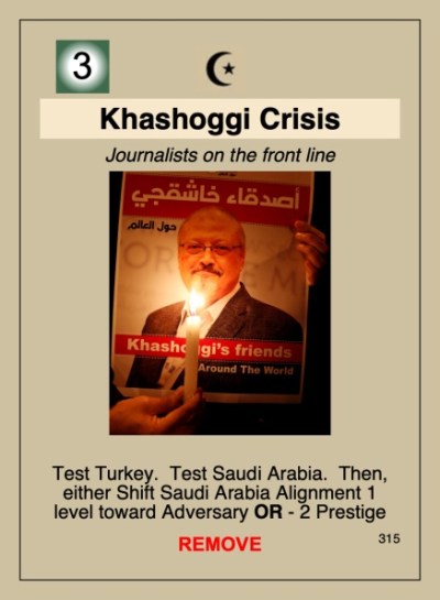 In our 2nd Event Card Spoiler post regarding Labyrinth: The Forever War, 2015-?, we take a look at card #315 Khashoggi Crisis. Please keep in mind that the artwork and layout of these cards is not yet finalized and is only for playtest purposes at this point. Also, as this political military simulation game is still in development, card details may still change prior to publication.