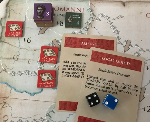 As I mentioned in the last point, Battles will become increasingly more difficult to win as you push the Barbarians back toward their Home space as their Terrain Value will increase. As you can see from the picture above, the Marcomanni Terrain Value is +6 and +8 in their last two spaces. This means that they are more often than not starting the Battle at an advantage with a +10 to +12 bonus to their Combat Roll. The highest that the Romans can get in these same spaces (without the play of an event) is a +11 but that is with a Level 2 Fort, which can be very hard to build, so more often than not they will be at only a +9 (6 Legions plus +3 for Marcus Aurelius’ Combat Value). In comes the importance of stacking up your event cards in these key battles as you look to throw the knockout punch that will force the Tribes to surrender and get out of the fight.