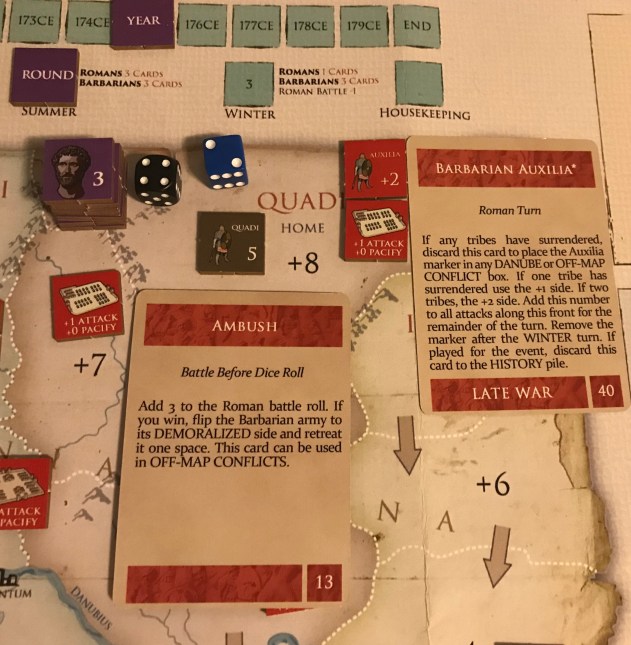 In Action Point 1, we examined the map and the various Barbarian Tracks down which the Marcommani, Quadi and Iazyges tribes move toward Roman territory. In Action Point 2 we looked at The Barbarian Deck and how the Barbarian Phase works. In Action Point 3 we looked at The Roman Deck and how the cards can be used for their printed events or discarded to take various actions in the Roman Phase and in Action Point 4 we looked at a few different examples of combat in the Battle procedure.
