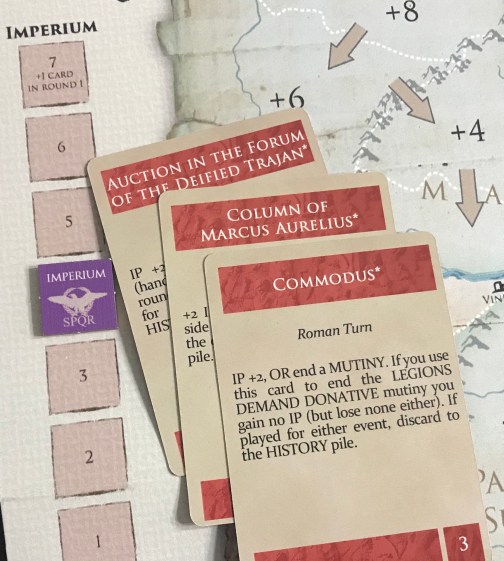 In my first 5 or 6 plays of the game, the most common way that I lost was by allowing the Imperium Point Track to reach zero, which results in Marcus Aurelius being usurped and the player immediately losing the game. I was confounded and very frustrated about why I couldn’t prevent this from happening! I could see the end coming but struggled with keeping that Track above water. There are a few cards included in The Roman Deck that provide increases to the Imperium Track and I highly recommend you take these events when they come into your hand rather than discarding these cards to take another action, that might seem important at the time, but in the end these events are just too efficient to pass on. In the above picture you can see three of these cards that you should be keeping an eye out for, including Commodus, Column of Marcus Aurelius and Auction in the Forum of the Deified Trajan.