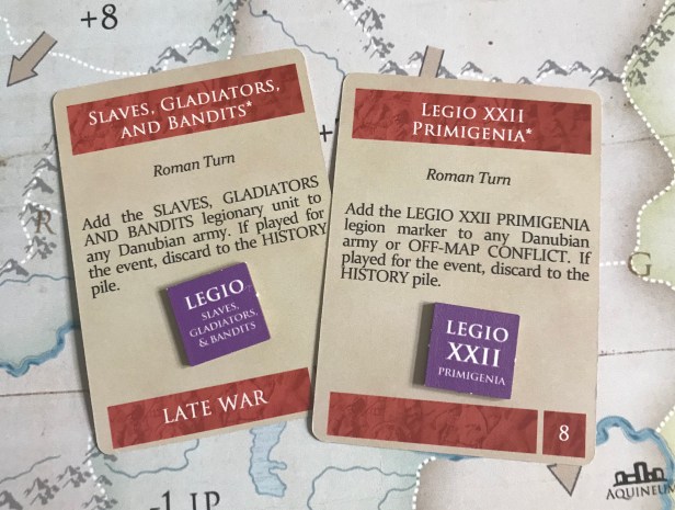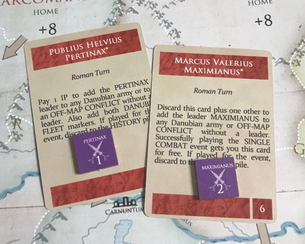 The basis of this game is defeating your enemies through Battles and you have to have good Leaders and Legions to do this. At the start of the game, you only start with a total of 10 healthy Legions, as two of them are recovering from the effects of previous Battles and the Plague, and there are a few Legions that haven’t been formed and released to join the war in the Danube (Legio XXII and Legio Slaves, Gladiators and Bandits). You must keep your eye out for the event cards that add Legions to your forces and that add better Leaders. These extra forces will be most important when you begin to force the Barbarians to surrender and must then switch from the work of waging war to keeping the peace as you attempt to Pacify them (see Strategy Point 5 below for more details). Pacification takes a combination of Leaders and Legions in the various subjugated Barbarian Tracks and the construction of Level 2 Forts from which to intimidate your foes into inaction and to launch patrols from to quell minor fires of rebellion. You cannot adequately staff these Forts and provide men to man them unless you add forces. 12 Legions (the 10 you start with along with the 2 Legions that recover and join your forces at the start of 171CE) divided by the three Tracks means that you can have only an average of 4 Legions at any given time in an army box and this just isn’t good enough. You have to prioritize using the events that add troops and Leaders or you will eventually fail. I know it is hard to not use those cards for other activities, such as increasing your IP Track, building Forts, putting down mutinies or moving armies to Off-Map Conflict boxes to deal with troubles, but you have to use these cards to increase your forces every time.