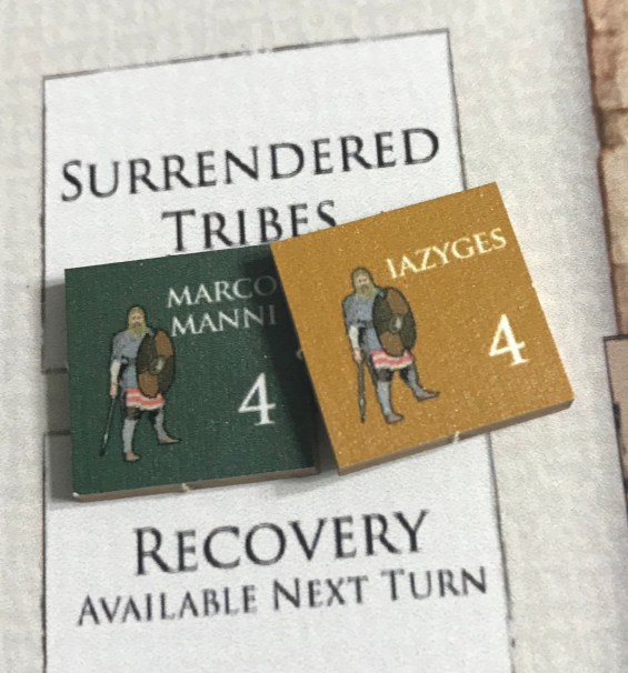 Remember that after Tribes have surrendered, and a Surge or Oathbreaker card event occurs, you will have to roll to determine if Pacified Tribes rejoin the fight. Believe me when when I say the worst thing that can happen in this game, besides an auto loss from the Usurpation or the Marcomanni reaching Rome, is a surrendered Tribe passing their check and reentering the fight! It is very deflating.
