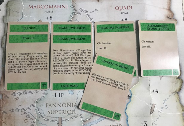 The above picture is a look at all of the nasty Imperium Point Track attacking cards contained in The Barbarian Deck, just in case you are still debating not listening to my sage advice. Scandal Faustina and Alexander of Abonoteichus simply take 1 IP but Plague and Plague Worsens are even…well…worse! You will not only lose 1 IP automatically but will roll a die and are going to lose at least 1 Legion with a chance of losing 2 Legions if you roll a 1. Nasty stuff! Also, keep in mind that if you roll a 1 while in combat with an army led by Marcus Aurelius you will also lose 1 IP. There are lots of ways to lose these important IP’s and only a few ways to gain them so use the events when they come up…you will thank me later as your chances of winning will improve drastically!