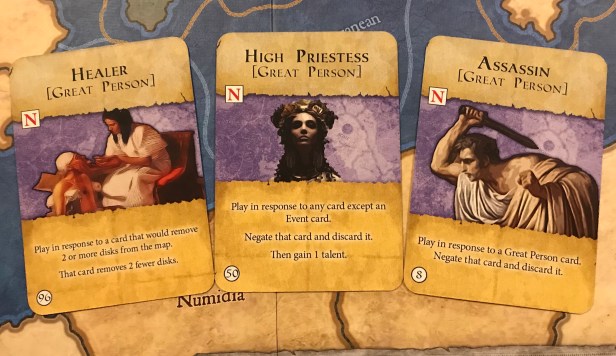 There are plenty of cards that can be played at anytime during the Card Phase as long as they don’t identify with one of the other names phases or types. These cards are either you place a certain number of disks or remove a certain number of disks of one of your opponents. Gain a certain number of Talents or take a certain number of Talents of one of your opponents.