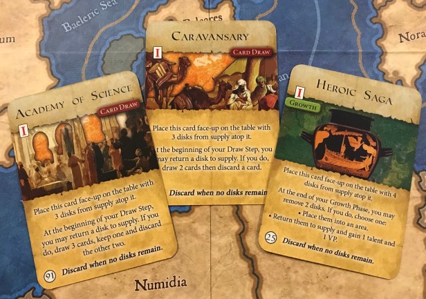 For example, Academy of Science states place 3 disks from the Supply on top. At the beginning of the Draw Step, you may remove a disk to the Supply. Draw 3 cards and keep 1 and discard the other 2.