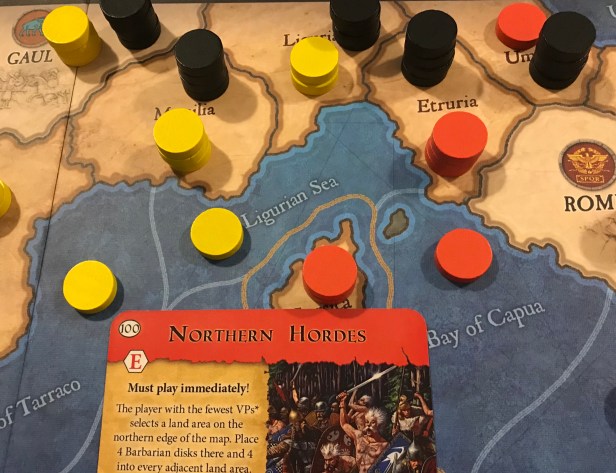 There are 5 of these Barbarian Invasion Cards among the 7 Event Cards so these will tend to come up often, or at least it feels that way. What happens when this card is played is the player with the fewest VP’s will choose a space on the part of the map identified (either North, South, East, Deep Sea or Shallow Sea adjacent to coastal land) and then place stacks of Barbarian disks (Black) in those spaces as directed on the card.
