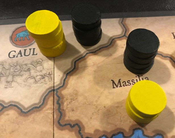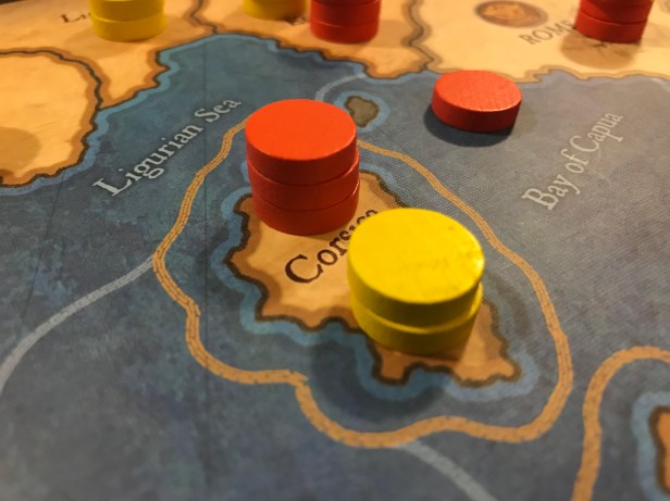 Competition Cards can only be played during the Competition Phase which is where opponents battle over Control of a Contested Area. In the picture below, you will see a competition between the Gauls (Yellow) and Romans (Red) over a Contested Area the island of Corsica. At this point in the competition the Romans have the advantage as they have 3 disks to the Gauls 2 disks. This means that short of a card being played the Romans will win the battle and each side will lose disks.
