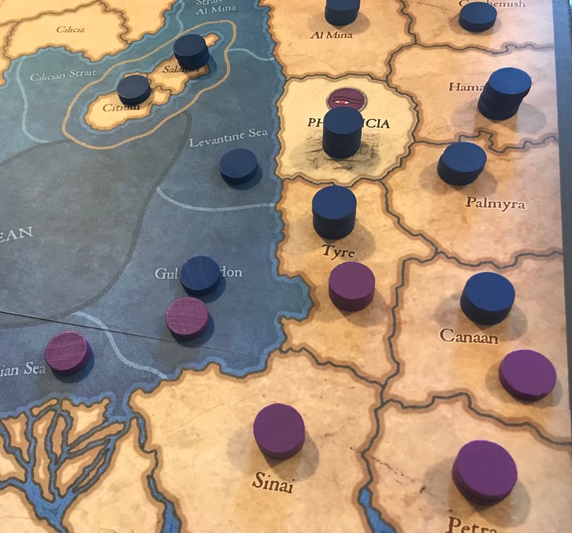 First, let’s take a quick look at what constitutes a competition. During the Competition Phase, a competition is defined as any area where at least 2 (or more) disks belonging to a single faction are present in an area with at least 1 disk (or more) belonging to any opposing faction. In each area that meets these criteria we will have what is referred to as a “contested” area. These contested areas are the only areas that can be affected during the Competition Phase. In the picture above, you will see that there are two areas that are currently contested, including Tyre (where there are 3 Phoenician disks and 2 Egyptian disks) and in Canaan (where there are 2 Phoenician disks and 1 Egyptian disks).