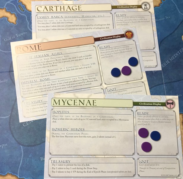 For example, Carthage has some very useful special abilities. Once per turn, at the beginning of the Competition Phase, you may the following three things; place a white disk in Carthage, which is the home area of that civilization, AND place a white disk in a contested land area where there is a Carthaginian disk AND into a contested sea area where there is a Carthaginian disk.