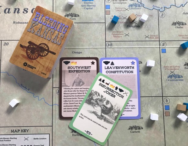 The core mechanism in the game is the cards. Each of these cards is tied to an historical event, important person or other factor involved in the conflict and allows players to choose their actions for that immediate turn. The game proceeds as players alternate the play of one of the cards from their hand to take various actions from symbols that appear on the cards. These symbols provide actions such as influencing new settlers to the region to join their side in the conflict, build up forces for the coming battle, take control of counties by moving these forces around or displacing those of your opponent, attacking the opposition, burning down their population centers, enticing settlers to migrate to their areas or request intervention from the Federal Garrison stationed at Leavenworth. The cards carry out the plans of players and create a historical narrative of the conflict.