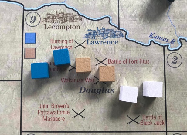 A bit of background on this action before we get into it. The game focuses on control of the various Kansas Counties when deciding the outcome of elections and how many VPs a player will receive. This control is determined by counting up the total Faction Points each side has in a county to determine control. Faction Points come from the presence of faction cubes at 1 per cube as well as 1 point for a faction aligned town and 2 points for faction capitals. For example, in the picture below, the Anti-Slavery faction has a total of 3 Faction Points in Douglas County (2 for blue cubes and 1 for Lawrence) while the Pro-Slavery faction has a total of 3 Faction Points (2 for butternut cubes and 1 for Lecompton).