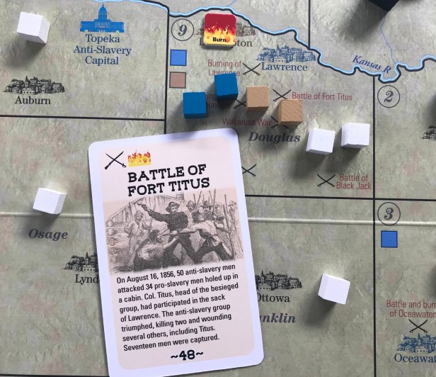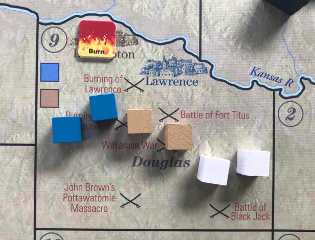 In our example below, the Anti-Slavery faction checks to make sure they have at least one faction cube present in the county, they actually have two cubes, and plays the card Battle for Titus, which contains a Skirmish symbol and a Burn symbol. They identify their target as the Pro-Slavery faction aligned Lecompton (colored lite brown) and places a Burn Marker over the town signifying that it has been burned. Note: There is no requirement to play matching cards to events that took place historically in the counties. In this example, the card used Battle of Fort Titus was an event that occurred in Douglas County but this is just a happy accident and not a prerequisite for the action being taken.