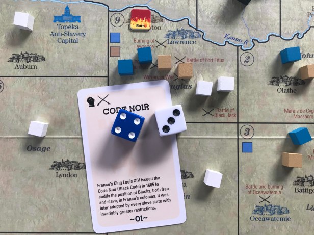 For example, in the below picture the Anti-Slavery faction player plays a Skirmish action with the card Code Noir and we count up the Faction Points. Anti-Slavery (blue) has a total of 3 Faction Points (2 cubes at +1 per cube with one faction aligned town in Lawrence adding +1) while Pro-Slavery (butternut) has a total of 2 Faction Points (2 cubes at +1 per cube). You will remember that in the previous action Lecompton was burned and a Burn Marker placed over it reminding us that it won’t add its +1 Faction Point to the total. This means that blue will add +3 to their die roll and butternut will only add +2.