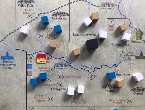 Only one such Burn Marker can be placed on a town or capital. The Town of Lecompton is now considered Burned and doesn’t add a Faction Point to the total in the county for purposes of determining control during an election or during other actions such as a Skirmish. One other note, when you place a Burn Marker on a faction capital, which counts as two Faction Points, the capital still provides 1 Faction Point toward determining control.