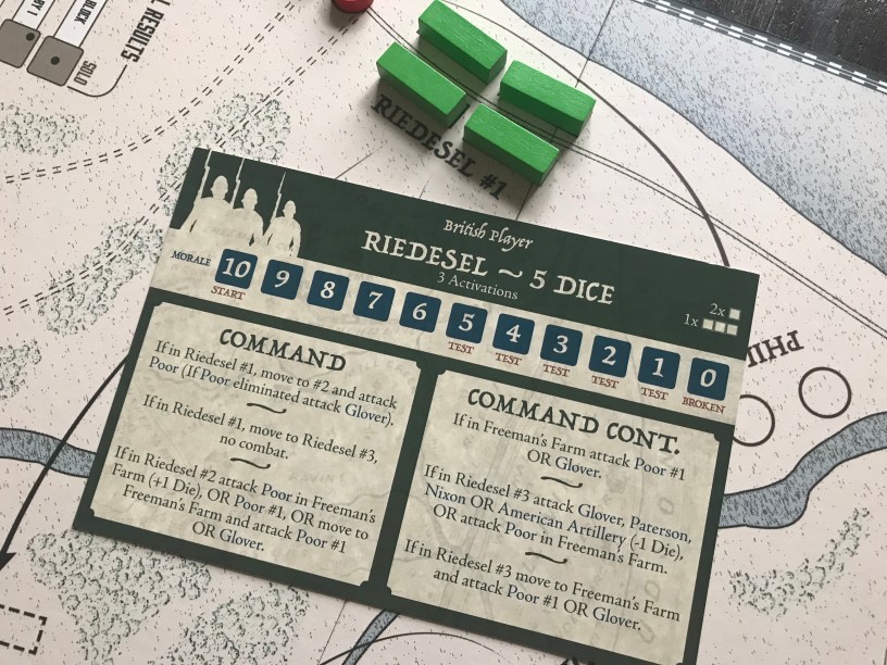 Riedesel is a powerful formation that uses 5 dice and has 10 starting Morale but only has 3 Activation Cards in the British deck. Historically, the Hessian mercenaries were on the battlefield to attack and all of their Commands deal with attacks on the Americans. The Riedesel formation has three positions on the board including Riedesel #1, Riedesel #2 and Riedesel #3. From their starting position on the board in Riedesel #1 they cannot attack any of the American formations. But, once they move to either #2 or #3, they have the option of attacking several of the American formations including Poor (if Poor is in Freeman’s Farm they will get +1 Die to their attacks), Glover if Poor is eliminated, Paterson, Nixon and American Artillery (albeit at -1 Die as they don’t have a good firing position on the American ramparts) if located in Riedesel #3