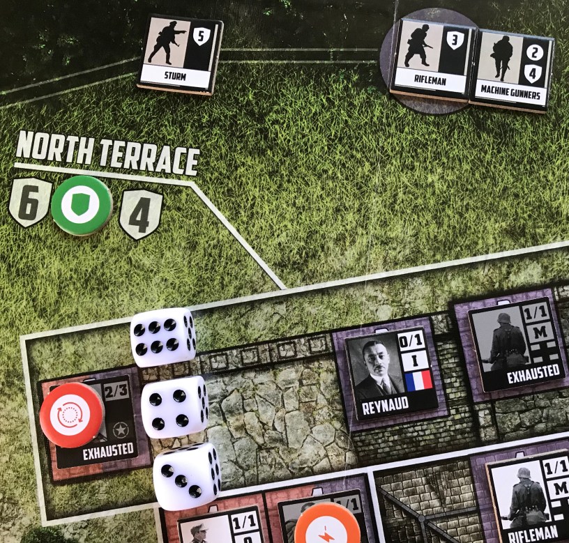 In the picture above, the Pollock Defender Unit decides to Attack the Sturm SS Unit from the North Terrace. Pollock has Line of Sight as they are located in a dual Red/Purple combat position and will be rolling 2d6 for their Attack Value plus an additional 1d6 for the Inspire Attribute bonus offered by Reynaud who is located in the same North Terrace Location. The extra dice helped as Pollock needed to roll a 5 or higher on the dice to hit and remove the Sturm SS Counter.