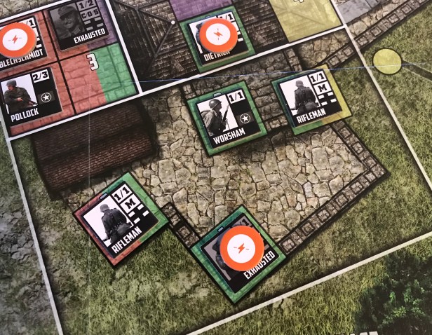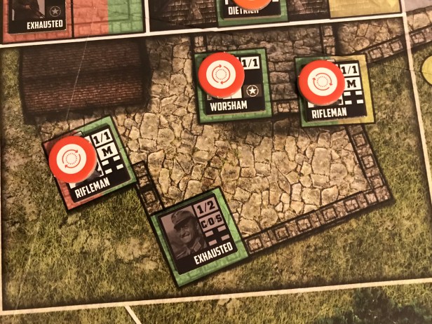 Gangl uses his Command Special Ability by Exhausting his own counter and then Recovering the 2 Rifleman and Worsham. Unfortunately, these Recovered Units are not able to take Actions this turn and will have an Action Marker placed on top of their counters to remind the player they cannot act this round. At the end of the turn, they will remove the markers and can take Actions as normal.