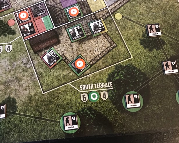 In the below picture you can see all of the 6 Green colored SS positions. They include the large initial placement circles numbered 2, 11 and 12 as well as three smaller circles to the right. Borotra is located in a Green combat position in the South Terrace and will attempt to Escape from there at the beginning of his turn. You will also notice that there are SS Counters located in the Green circles that correspond to the South Terrace and this is the first requirement for Borotra to make his Escape attempt. The second requirement is that he is not Exhausted. This is quite tricky as you will have to take at least 2 turns to meet all of the conditions of the requirements for the Escape as the other Units in the Location will have to pick off the SS Counters and Borotra must have moved to this Location or been Recovered from the previous turn.
