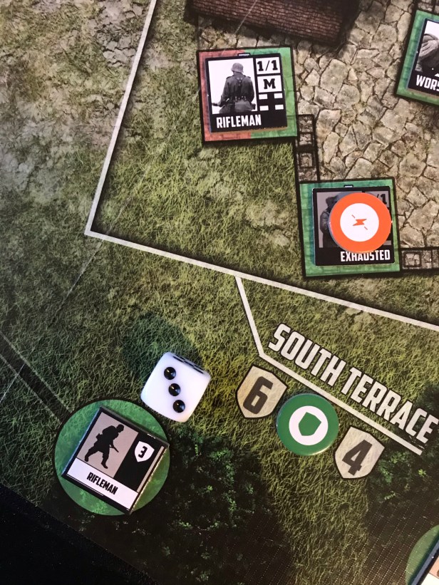 The roll is a 3 and is successful as it is equal to or greater then the target Unit’s Defense Value of 3. This successful Attack removes the SS Rifleman counter to the supply and the player then must Exhaust the attacking Unit by turning it’s counter over to the Exhausted side.