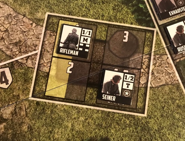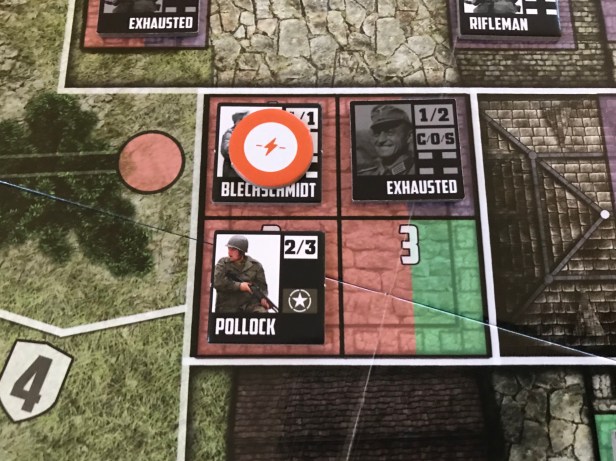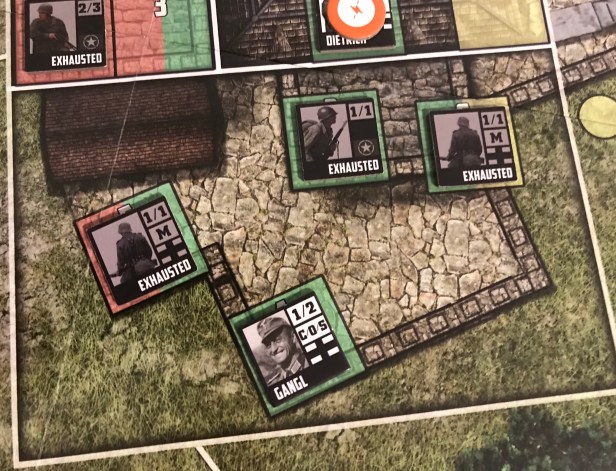 In our example picture above, Tanker Seiner wants to move to the 4 -6 combat position located in the Gatehouse because he wants to fire the M1919A4 Browning machine gun at an SS unit on an assault track. Because he is not Exhausted nor has a Disrupted token and because the Defender Rifleman Unit in the target position is also neither Exhausted nor has a Disrupted token this Action can be completed. The Units simply switch combat positions.