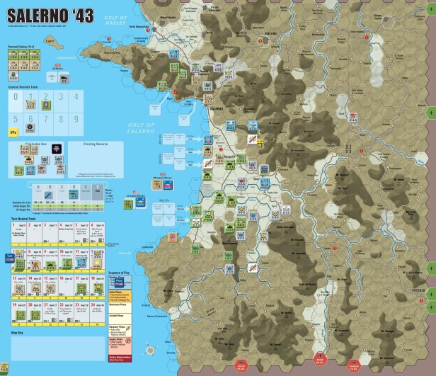 • A new operational-level WWII game from a popular designer – I will guess here but I am not sure I am right. Salerno ’43 from designer Mark Simonitch. Here is a map I found: