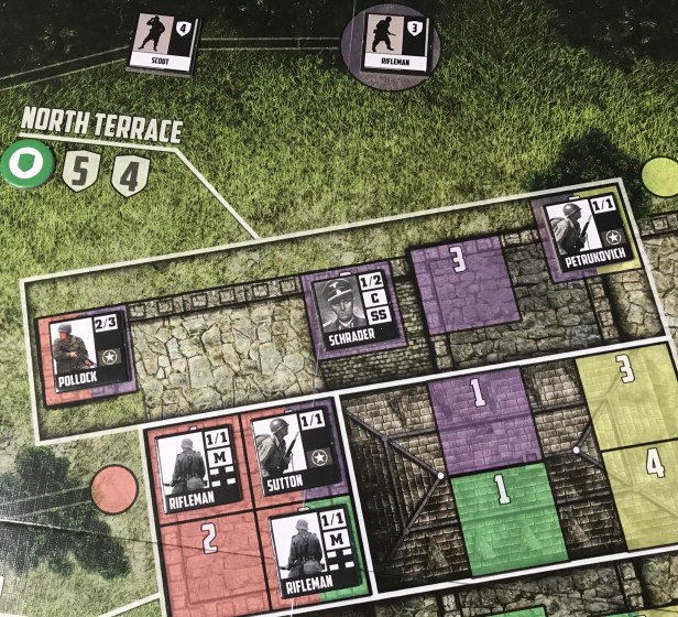 I would also recommend deploying Pollock with his 2 Attack Value and 3 Suppress Value into a dual Red/Purple or Purple/Yellow combat position in the North Terrace and also using his Suppress Value to generate 3 suppress tokens to be used to keep SS Counters off the board. With two placements remaining in the 1st turn I would also place one of the Commanders in this Location as well in order to keep Pollock fresh and able to fire and suppress. With the final placement in the first round, I like to look at the most commonly rolled numbers on 2d6, which seem to be 5-9 and place a Rifleman in a space that can take a pot shot at one of the SS Counters in this spot. You have a 66.6% chance of hitting and to start with one of those spaces clear is always a bonus.