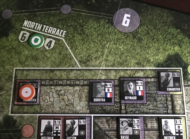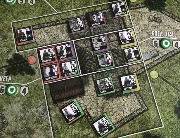 In future rounds, you will need to spread out your limited Commanders by placing one in each of the major Locations (North Terrace, Great Hall, South Terrace and Besotten Jenny) so that you can keep troops fresh to attack the SS Counters. You will also want to place the Low Morale Rifleman Units with the Wehrmacht Officer Counters as much as possible in order to keep them from breaking when another Unit is destroyed. There is nothing quite so bad as seeing a few Low Morale Rifleman break because another Unit is killed in their same Location. It can kind of be like a line of dominoes falling if you are not careful!