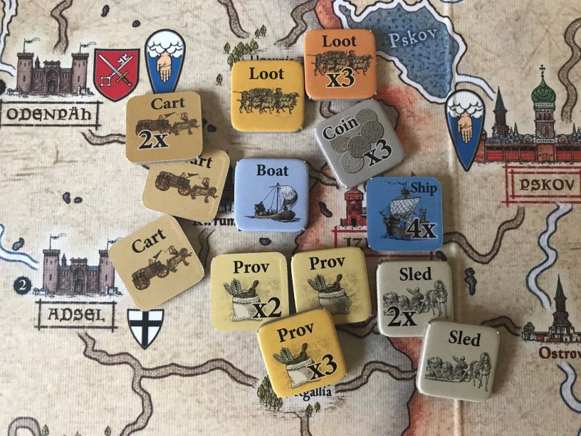 Nevsky is a wargame about the age old struggle between Latin Teutonic and Orthodox Russian powers along the Baltic frontier of the mid-thirteenth century. The game is the first entry in a new series called the Levy & Campaign Series which focuses on pre-industrial age conflicts and, as you can see from the name of the series, requires players to focus on some of the logistics aspects of warfare including providing for the payment and feeding of your vassals and their troops as well as planning out the length of service of your hirelings. This game is a very new experience for me as we had to think differently about how to go about prosecuting a war in a foreign land where you are far from your supply sources and have only a limited time to accomplish your goals before your time is up. Well, now that I think about it, that statement isn’t actually true as I have played lots of East Front WWII games where the Germans are invading Russia. This game is kind of that situation just 700 years earlier before there were tanks. But rather than tanks, carts and sleds are your mobile units.